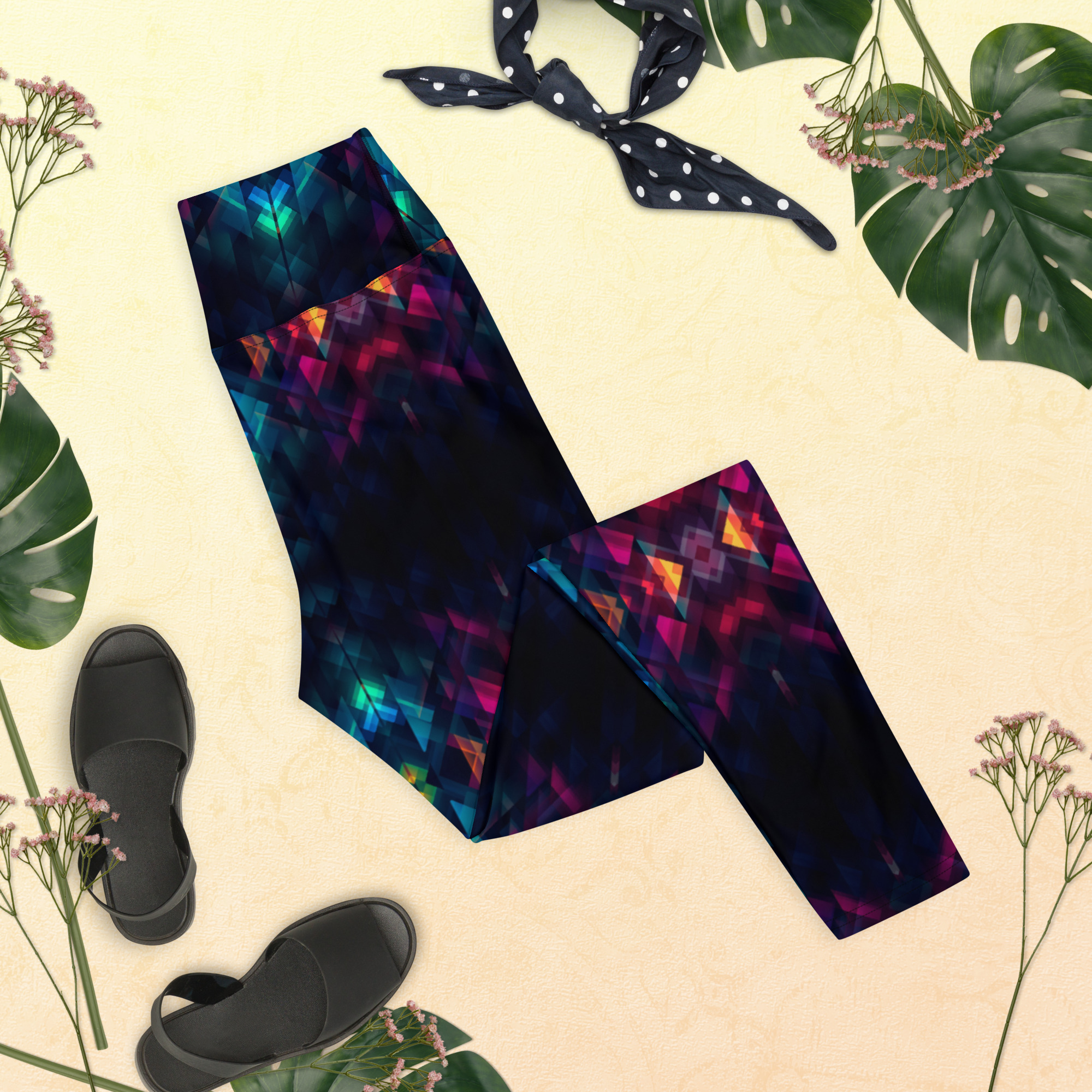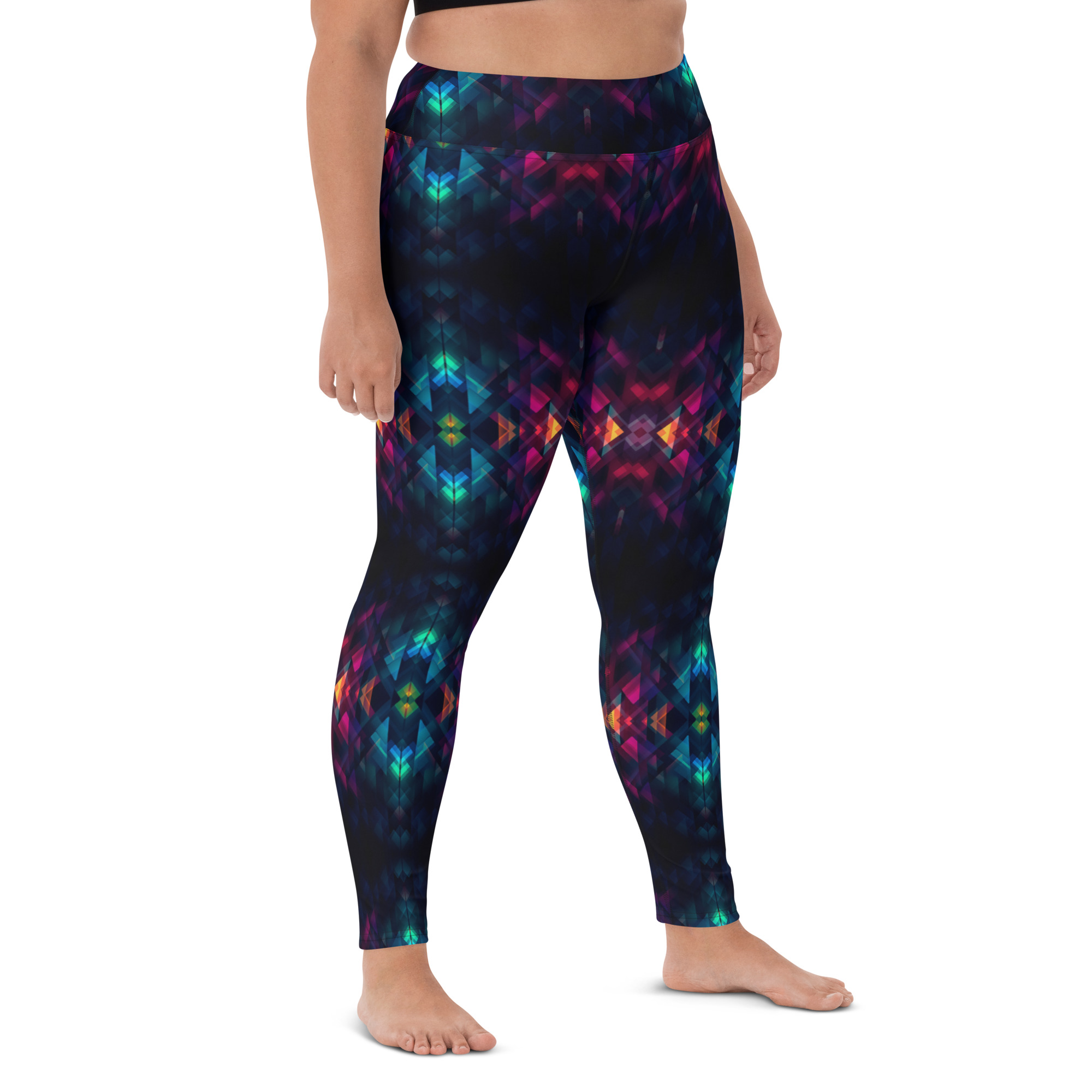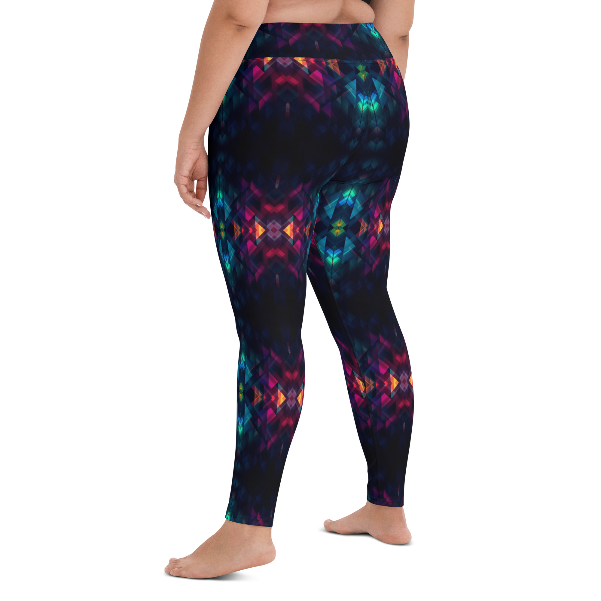 These stylish yoga leggings plunge you into a vortex of midnight darkness and mind-bending geometry. Striking triangles, squares and rhombi in jet black seem to swirl and spin across the legs, hinting at cosmic mysteries.