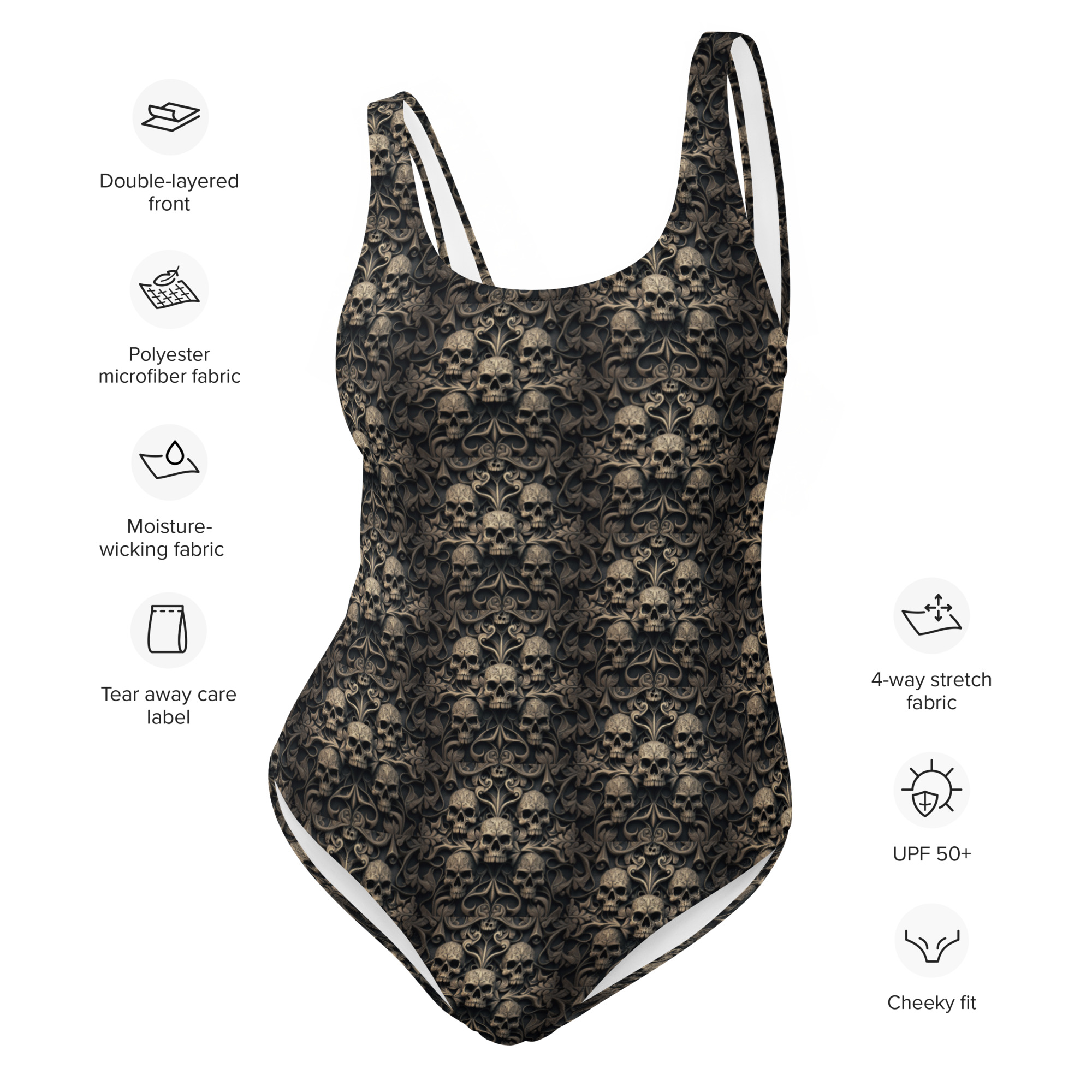 With comfortable padding and straps, the Gothic Skull Bathing Suit contours and flatters your curves. The slimming design elongates your frame and cinches you in at the waist without added bulk. Patterned details trace down the sides and leg openings in a fierce yet graceful way, balancing spook and sophistication.