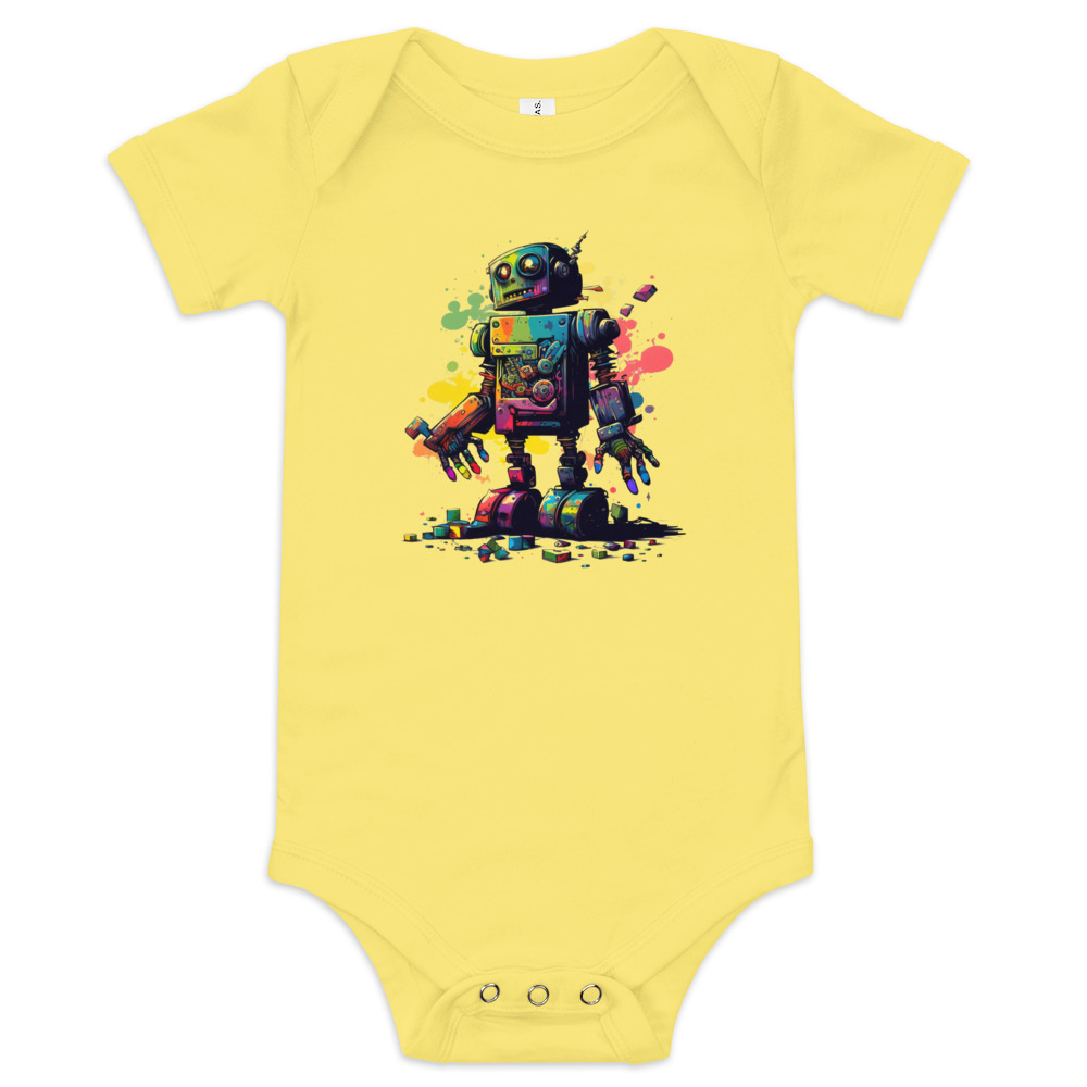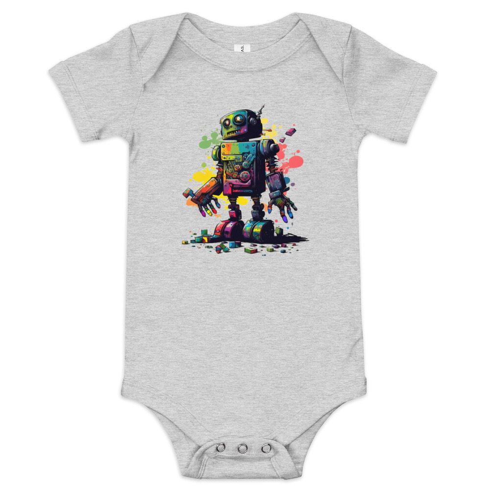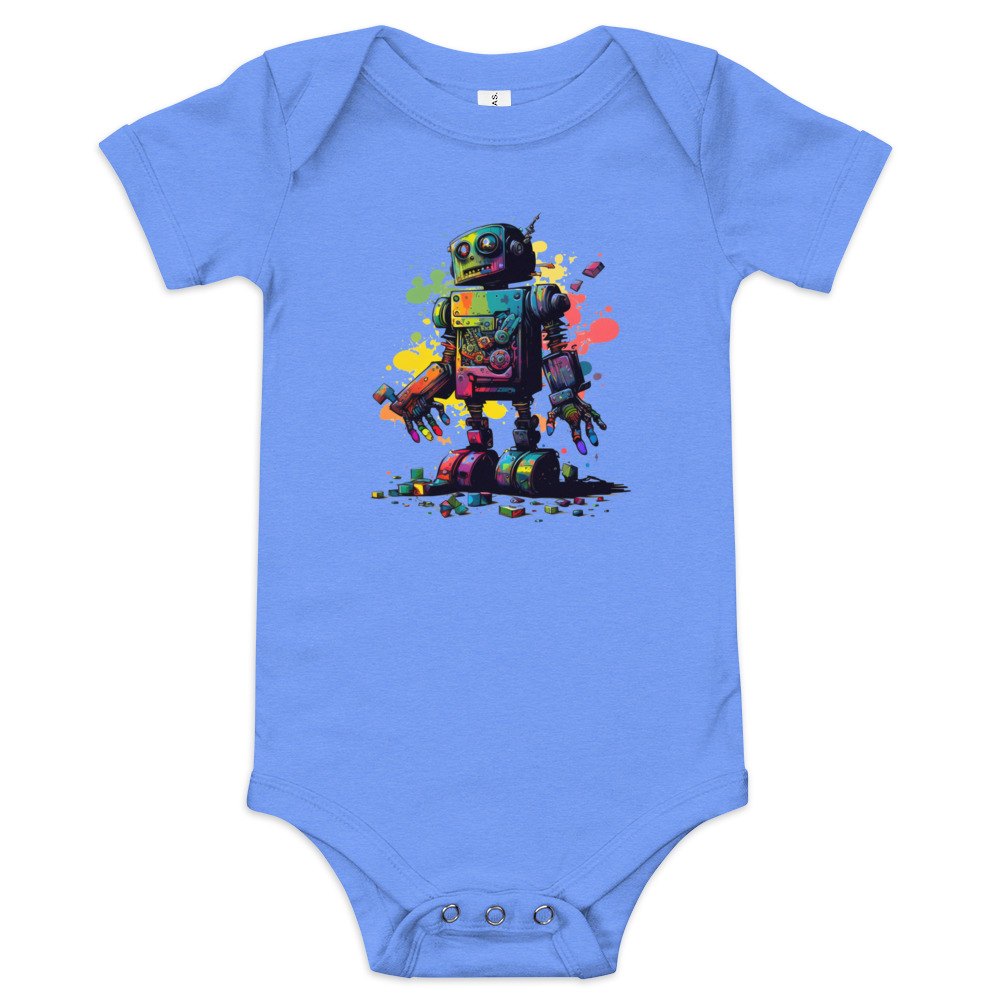 Made of ultra-soft cotton jersey, this onesie keeps baby comfortable, cozy and ready to spread cheer with each step, slide or stretch of imagination. Ribbed crews and neckline provide freedom for exploring with as much enthusiasm as this bright bot within, while reinforced seams run along high-stress points to weather the messiest of play without a care.